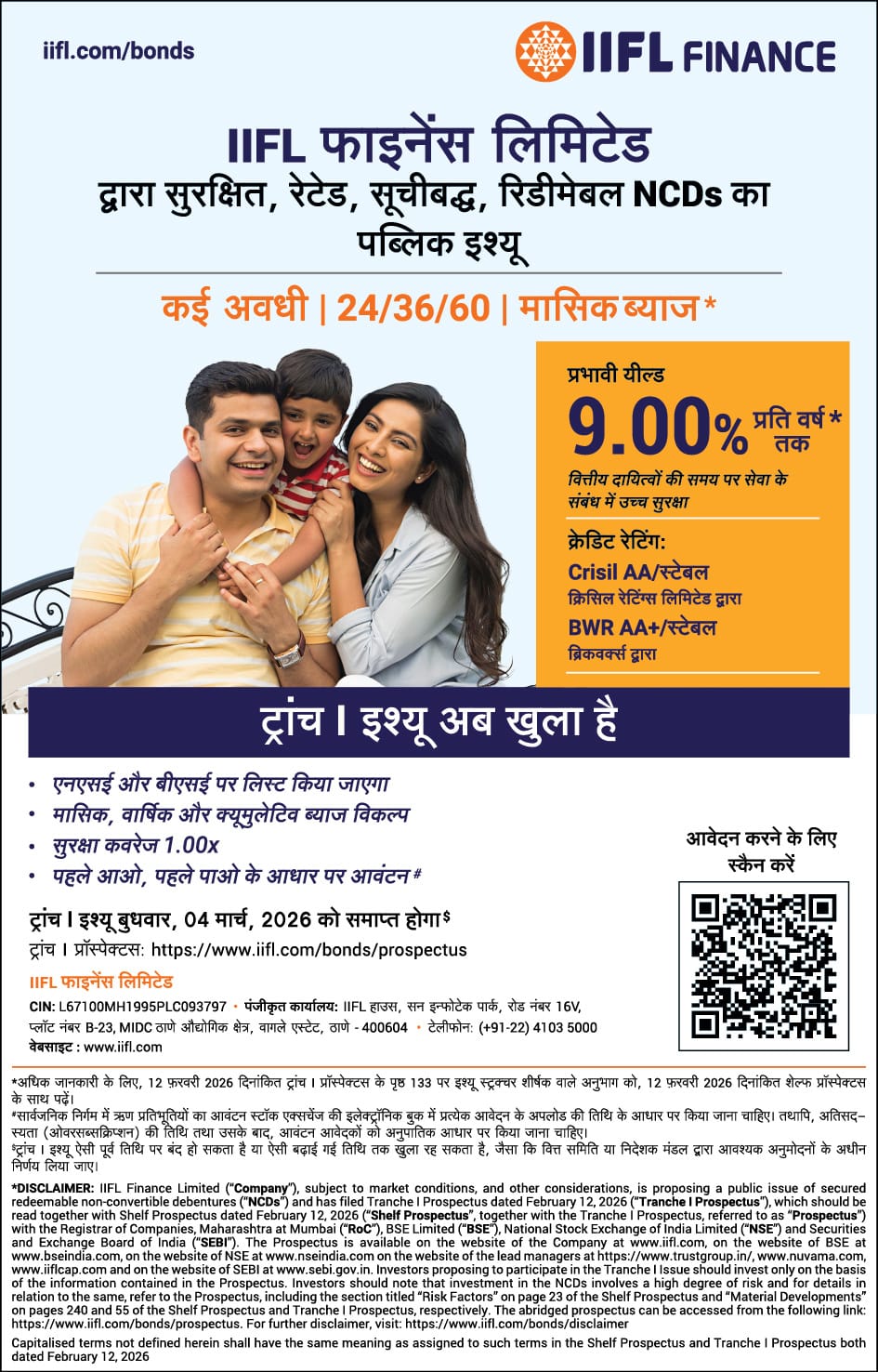 देहरादून।(BNE) देश की प्रमुख नॉन-बैंकिंग फाईनेंशियल कंपनियों (एनबीएफसी) में से एक, आईआईएफएल फाईनेंस लिमिटेड ने रिडीमेबल नॉन-कन्वर्टिबल डिबेंचर (एनसीडी) के पब्लिक इश्यू जारी किए हैं, जो मंगलवार, 17 फरवरी, 2026 से मिलना शुरू होंगे। इनका इश्यू साईज़ 500 करोड़ रुपये है, और 1,500 करोड़ रुपये तक का ओवरसब्सक्रिप्शन बनाए रखने के लिए ग्रीन-शू विकल्प है। इस प्रकार कुल इश्यू साईज़ 2,000 करोड़ रुपये का होगा। इस फंड का उद्देश्य कंपनी के व्यवसाय में वृद्धि करना और पूंजी बढ़ाना है।