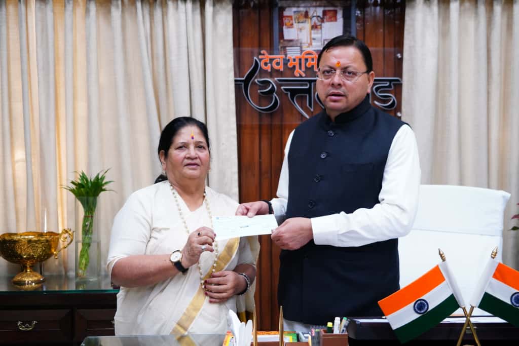 प्रसिद्ध पर्वतारोही एवं पद्म भूषण सम्मान प्राप्त बछेंद्री पाल ने शनिवार को मुख्यमंत्री राहत कोष के लिए 10 लाख रुपए का चेक प्रदान किया। यह चेक उनकी ओर से राज्य महिला उद्यमिता परिषद की उपाध्यक्ष श्रीमती विनोद उनियाल द्वारा मुख्यमंत्री को सौंपा गया।