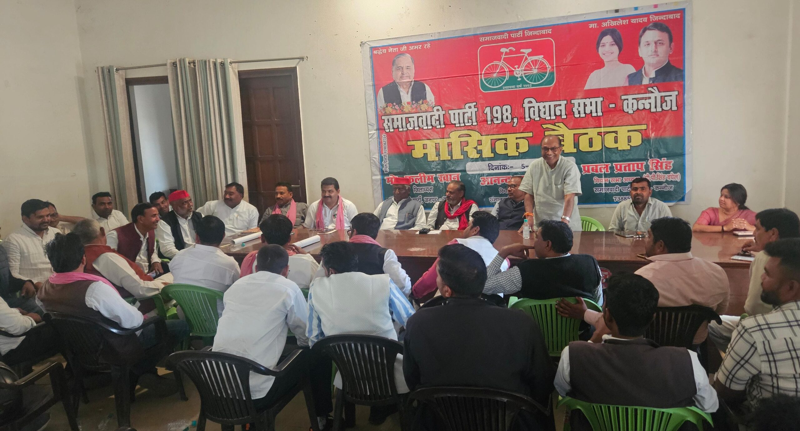 कन्नौज(BNE)आज समाजवादी पार्टी कार्यालय में कन्नौज विधानसभा क्षेत्र की मासिक बैठक जिलाध्यक्ष कलीम खान की अध्यक्षता एवं विधानसभा अध्यक्ष पी0पी0 सिंह बघेल के नेतृत्व में सम्पन्न हुई। कार्यक्रम में उपस्थित जिलाध्यक्ष कलीम खान,पूर्व विधायक कल्यान सिंह दोहरे एवं विधानसभा अध्यक्ष पी0पी0 सिंह बघेल ने कार्यकर्ताओं को आगामी विधानसभा चुनाव के लिए एकजुट होकर जुटनें एवं लोगों के सुख दुख में लगातार शामिल होते रहनें के लिए प्रेरित किया। उन्होनें कहा कि लोकसभा चुनाव की जीत जनता के प्रति हमारी जिम्मेदारी को बढ़ाती है इसलिए पार्टी के प्रत्येक कार्यकर्ता को अपने अपने क्षेत्र में लोगों के बीच सकारात्मक रूप में सक्रीय भूमिका में रहना चाहिये।
