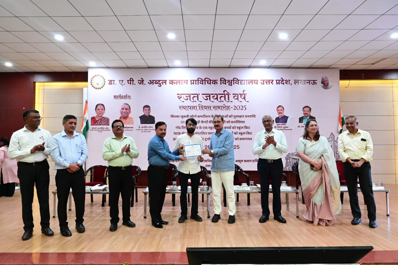 डाॅ एपीजे अब्दुल कलाम प्राविधिक विश्वविद्यालय में शनिवार को सिल्वर जुबली वर्ष एवं 25वां स्थापना दिवस धूमधाम से मनाया गया। इस दौरान विभिन्न कार्यक्रम आयोजित हुए। कार्यक्रम में सिल्वर जुबली लोगो काॅम्प्टीशन के विजेताओं को पुरस्कृत किया गया। इसके अलावा विश्वविद्यालय के गोद लिये गये पांच आंगनबाड़ी केंद्रों की कार्यकत्रियों को प्रशस्ति पत्र दिया गया। साथ ही गोद लिये गये स्कूलों और आईईटी में छात्रों की ओर से संचालित परमार्थ के 25-25 बच्चों को किट दिया गया। साथ ही इंट्रा यूनिवर्सिटी स्पोट्र्स टूर्नामेंट के विजेताओं और प्रतिभागियों को प्रमाणपत्र दिये गये।