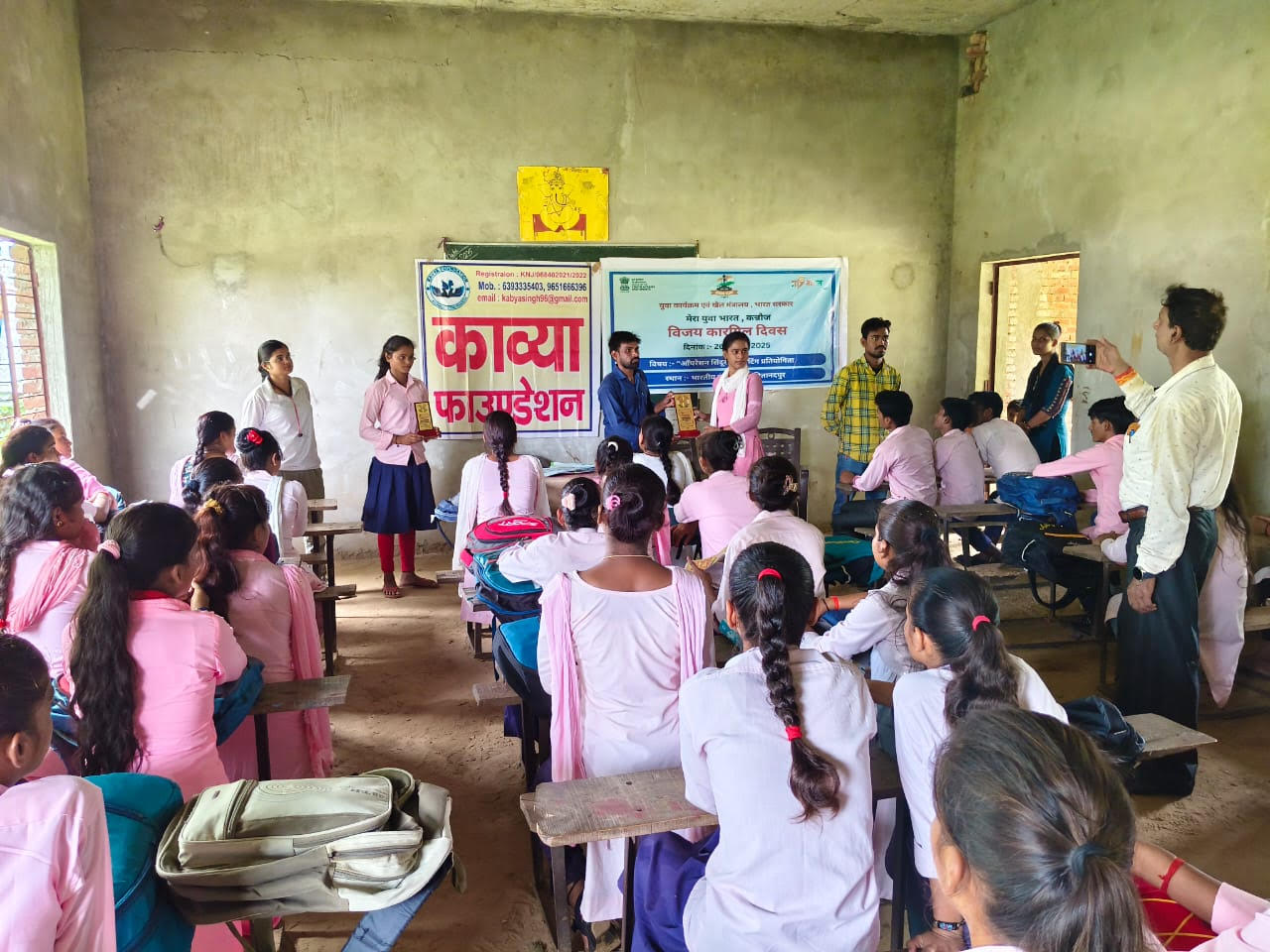 कन्नौज। युवा कार्यक्रम एवं खेल मंत्रालय , भारत सरकार के अंतर्गत मेरा युवा भारत कन्नौज एवं काव्या फाउंडेशन के संयुक्त तत्वाधान मे 26 जुलाई को कारगिल विजय दिवस के अवसर पर विकास खंड गुगरापुर मे भारतीय इन्टर कॉलेज नितानदपुर मे पेंटिंग प्रतियोगिता का आयोजन किया गया। छात्रों द्वारा पेंटिंग प्रतियोगिता के विषय “ऑपरेशन सिंदूर” पर सुंदर चित्रकला का प्रदर्शन किया गया। कार्यक्रम मे जिला युवा अधिकारी एवं विद्यालय प्रधानाचार्य श्रीनिवास द्वारा शहीद सैनिकों को पुष्प अर्पित करके एवं दीप प्रज्वलन करके कार्यक्रम का उद्घाटन किया गया । जिला युवा अधिकारी सागर माहेश्वरी द्वारा छात्रों को भारत और पाकिस्तान के बीच मई से जुलाई 1999 तक लद्दाख के कारगिल ज़िले में होने वाले कारगिल युद्ध के विषय मे विस्तरत जानकारी दी गई एवं भारत के साहसिक एवं निडर सेना के बारे मे छात्रों को अवगत कराया गया । वही प्रधानाचार्य द्वारा छात्रों को भारतीय सेना मे सेवा देने का आवाहन किया गया । कार्यक्रम का संचालन प्रतीक्षा कटियार एवं राजेन्द्र कुमार के सहयोग से किया गया । एक पेड़ माँ नाम कार्यक्रम अंतर्गत छात्रों से सैनिकों के नाम पौधरोपण विद्यालय परिसर मे कराया गया । पेंटिंग प्रतियोगिता मे प्रथम द्वितीय एवं तृतीय स्थान प्राप्त किया । कार्यक्रम मे अंकित , सुमित , रोहित, सुशील आदि युवाओं की सहभागिता रही ।